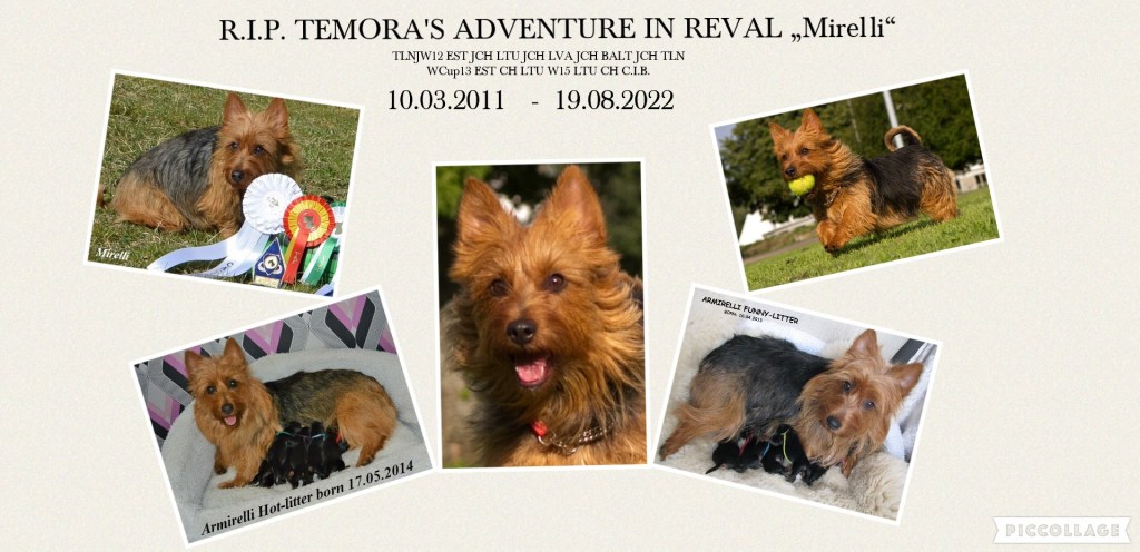 Missy – my first Australian Terrier, the first breeding Aussie in Estonia, my best teacher in aussie-world, my passionate partner in showring and in all my life. Rest in peace, our lovely Missy! Great thank you to Anne for this fantastic Aussie!